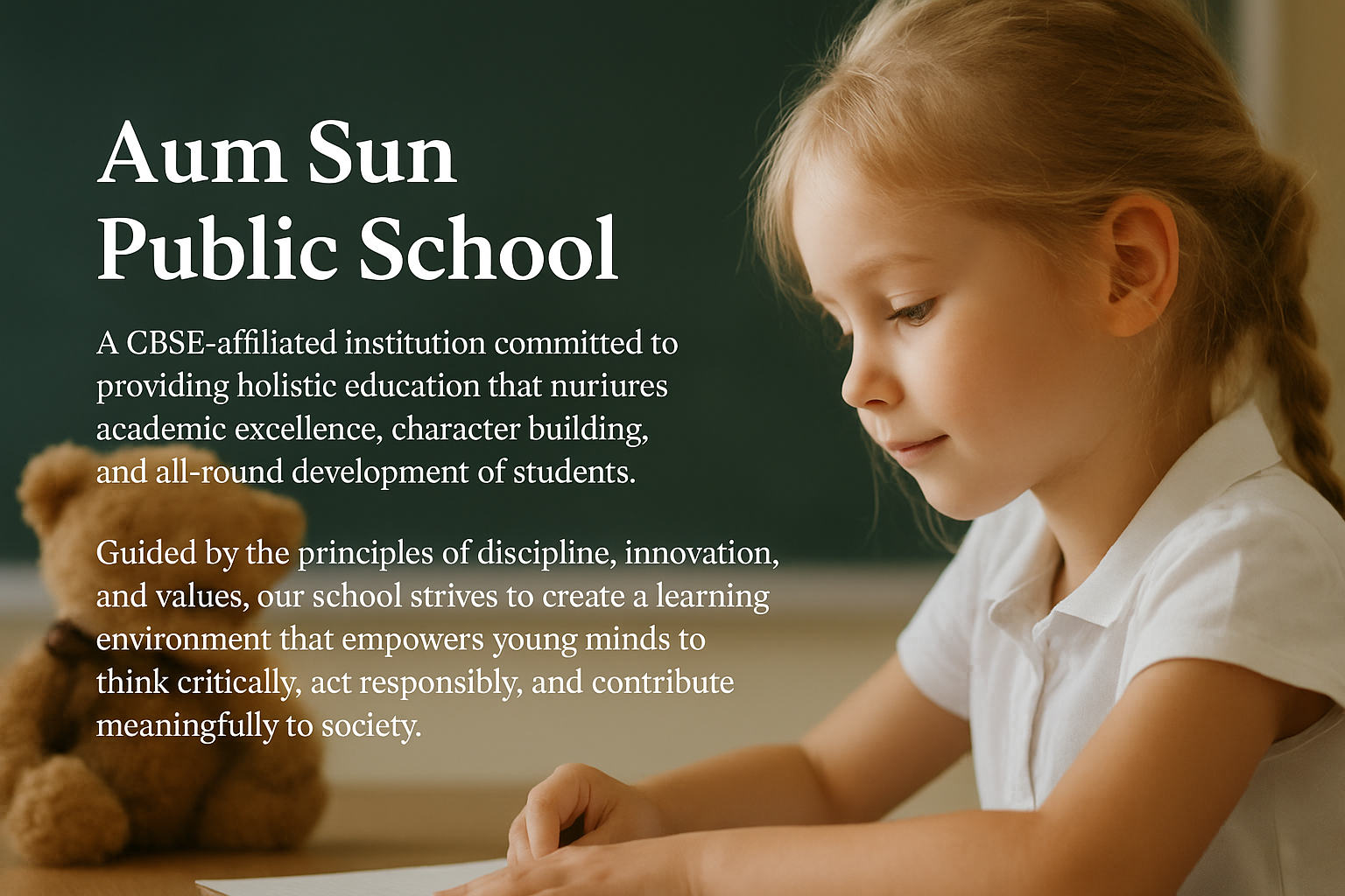 Aum Sun Public School, a CBSE-affiliated institution, is dedicated to delivering holistic education that fosters academic excellence, character development, and the all-round growth of students. Rooted in the principles of discipline, innovation, and values, we strive to cultivate a learning environment that inspires young minds to think critically, act responsibly, and contribute positively to society. Our school follows the CBSE curriculum, which prioritizes conceptual understanding, co-scholastic development, and skill enhancement. Beyond academics, students actively engage in sports, cultural activities, community service, and co-curricular programs, helping them explore their talents and build self-confidence for the future. Supported by a team of committed educators, state-of-the-art infrastructure, and a child-centered approach, Aum Sun Public School stands as a true temple of learning where every child’s potential is recognized, nurtured, and celebrated. Together, we envision shaping lifelong learners and responsible citizens who will lead with wisdom and integrity.